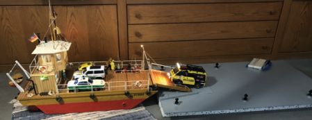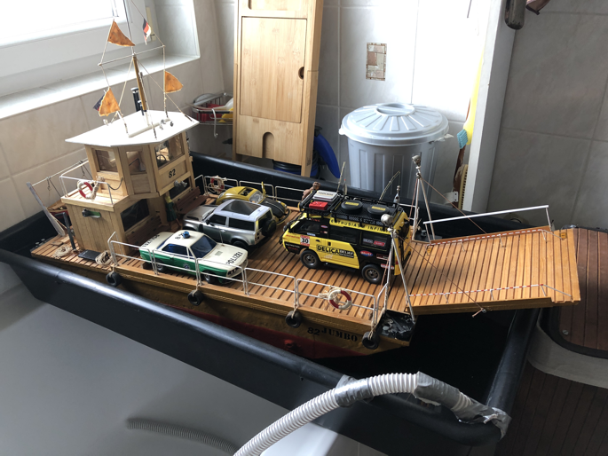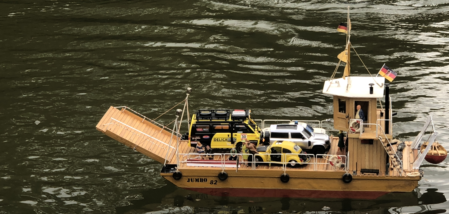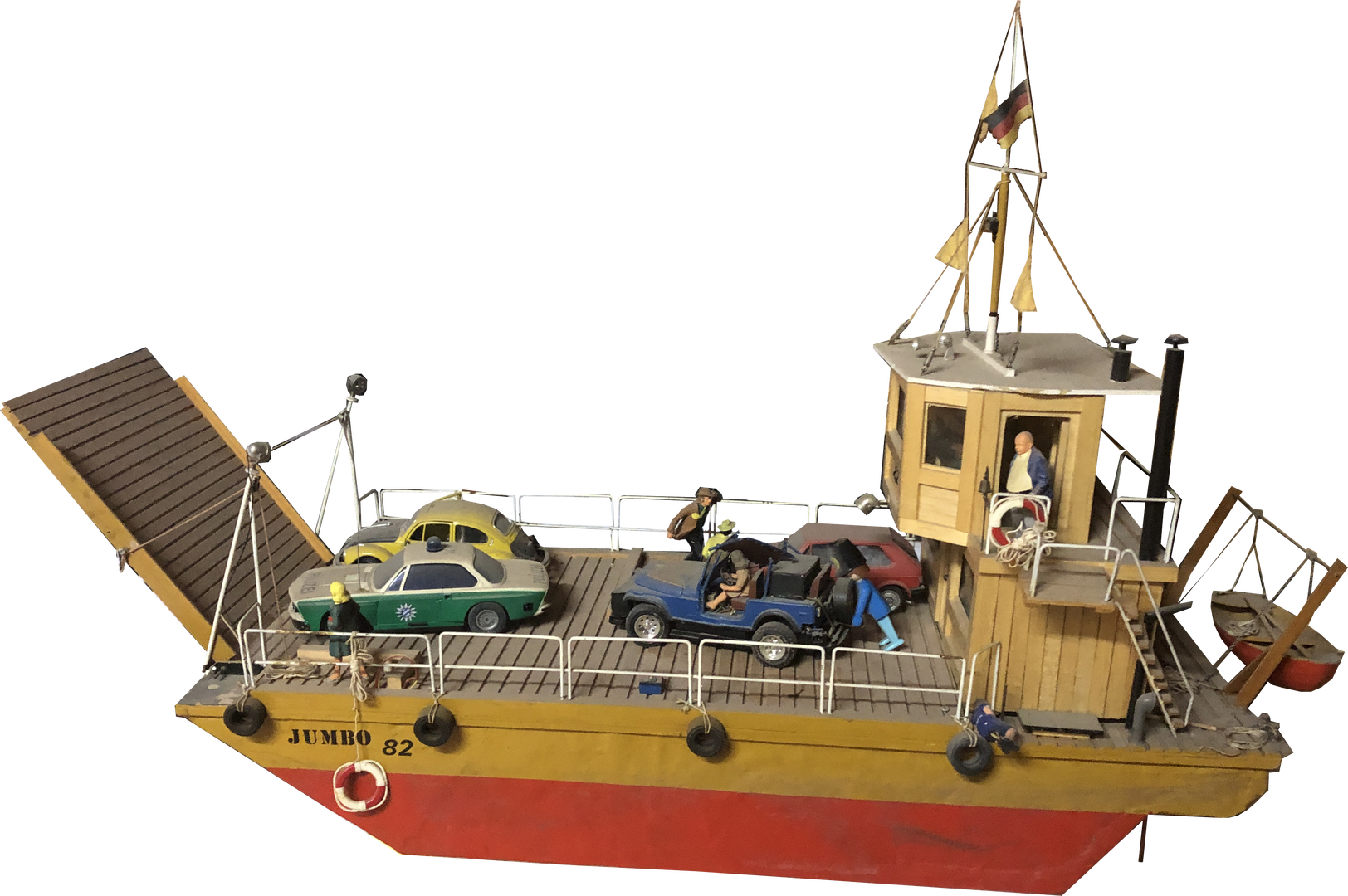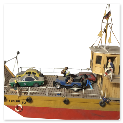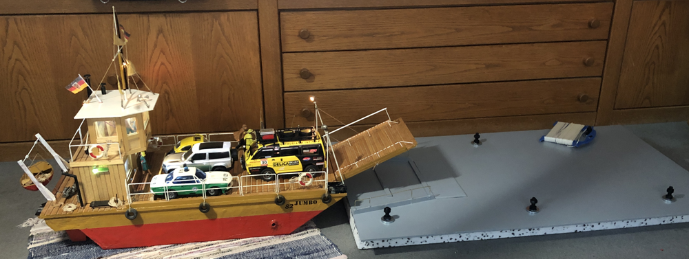 Die Flussfähre ist einer Erinnerung auf der Elbe nachgebaut. Das Modell Jumbo 82 entstand im Jahr 1982 und schlummerte viele Jahre auf dem Dachboden. Der blaue Jeep war ferngesteuert. Mal sehen, ob er einen Nachfolger findet.