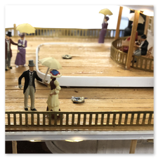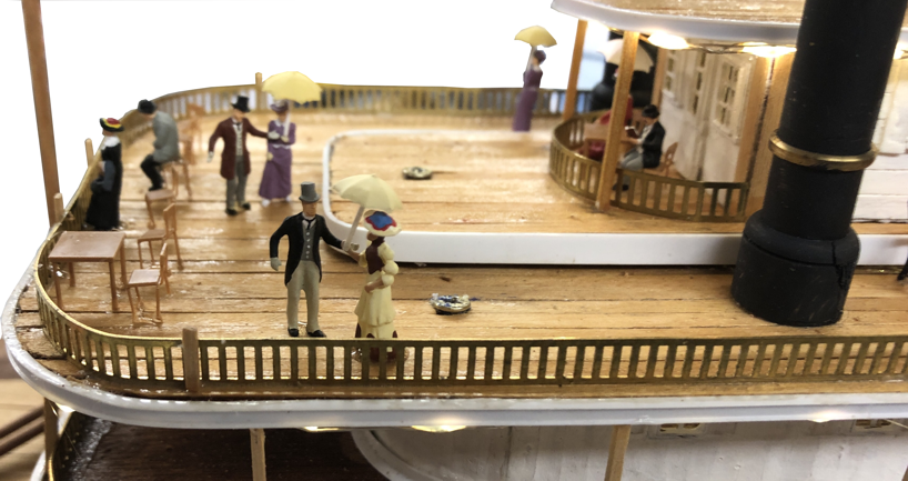 Der Aufbau wird farblich anders bearbeitet, wie es die Vorlage auf dem Karton zeigt. Das Zubehör im Bausatz ist reichlich. Die Fenster sind allerdings gegossen und undurchsichtig. Da ich den Dampfer später beleuchten will baue ich Fenster aus dem Bereich der Modelleisenbahn ein. Passende Größe gibt es. Die Fensterläden schneide ich aus Furnier-Strips.