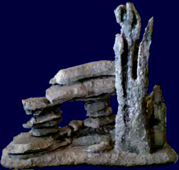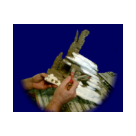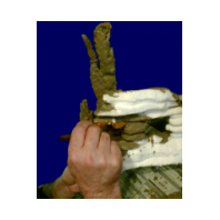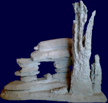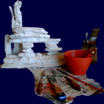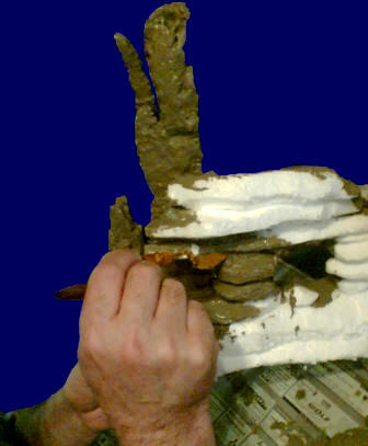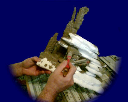 Mehr als beim Hintergrundfelsen, der hinter dem Becken steht, wird hier absolut auf die Abdeckung mit Fliesenkleber schon beim ersten Einstreichen geachtet. Ein Feinspachtel, wie ich ihn in meiner Ölmal-Kiste habe, hat hier vortreffliche Dienste geleistet. Der Fliesenkleber wird dickbreiig - etwa die Konsistenz von Zahncreme - grob mit dem Pinsel aufgetragen. Mit dem Ölspachtel schiebe und schließe ich die feinsten Fugen des Styroporsteines.