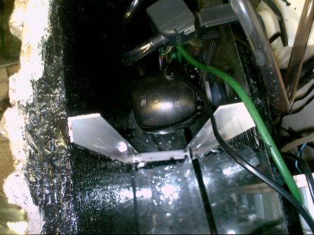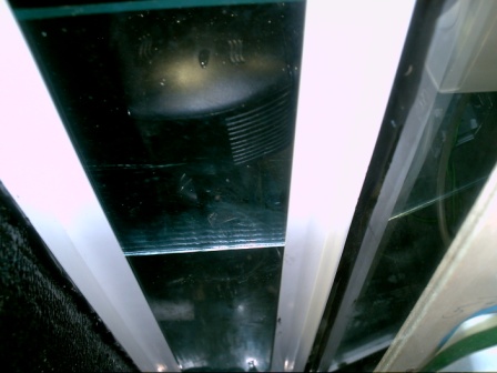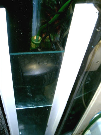 Links sieht man die Hauptfilterkammer. Mit doppelten Kunststoffwinkel-Leisten wird ein Führung für die Glasscheibe eingeklebt. Um in die Hintere Frischwasserkammer zu gelangen, muss das Wasser erst durch die Hauptkammer mit Filtermaterial, um dann in die Frischwasserkammer über zu laufen. Ein Blick in die Frischwasserkammer. Hier hat auch noch der Heizstab seinen Platz gefunden. Obere Pumpe sorgt für Oberflächenwasserströmung.