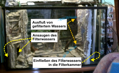 Aus Platzgründen habe ich nur zwei Kammern eingebaut. Mit den blauen Filter-Schwämmen habe ich in dem Kindergarten-Projekt sehr gute Erfahrung gemacht. Deshalb denke ich, dass ich mit zwei unterschiedlichen Filterdichten, zusätzlich Aktivkohle, wenn benötigt, ausreichend hinkomme. Zur Reinigung oder technischen Betreuung der hinteren Kammer lässt sich die Trenn-Scheibe heraus ziehen. Auch der UV-Filter hat noch in der Frischwasserkammer Platz. Die Pumpe unten sorgt für die Bodenströmung.