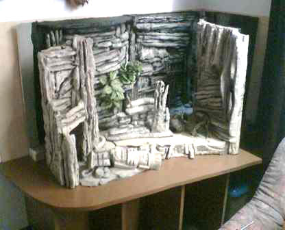 Die Rückwand ist aus 10mm Sperrholz. Zum einen wird die Platte unbehandelt und mit Abstandsunterlagen angeschraubt, damit die Wand hinter dem Becken atmungsfähig bleibt; zum anderen dient diese Rückwand als Befestigungswand für den Hintergrund. Schließlich sind die Felsen aus Styropor. Es handelt sich bei der Wohnungswand um eine, wenn auch isolierte Außenwand. Genau deshalb achte ich darauf, dass kein Schwitzwasser entstehen kann und durch den Abstand der Aquariumrückwand zur Wohnungswand eine Hinterlüftung gewährt ist.