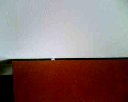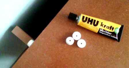 Ganz einfach erreiche ich diesen Effekt, in dem ich Möbelgleiter aus Plastik an die äußeren Kanten der Tischplatte klebe.