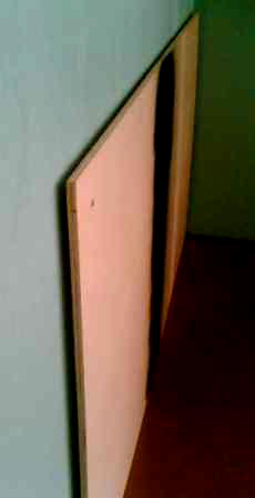 Auch für die Sperrholz-Rückwand werden diese "Abstandshalter" eingebaut. Die Montagewand aus Sperrholz wird beim Anschrauben an der Außenwand mit Dübel und Abstandhalter befestigt. Zusätzliches Festkleben des Abstandshalters fixiert diesen auf der Holzplatte.