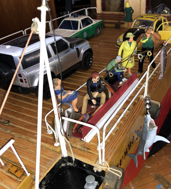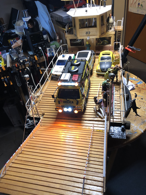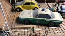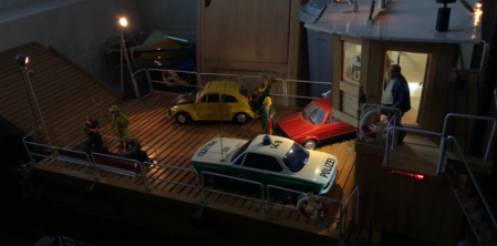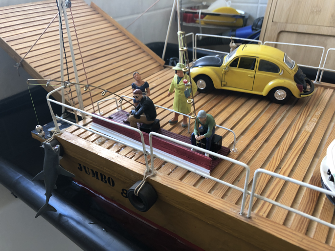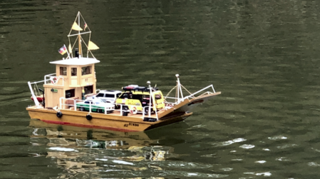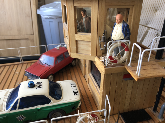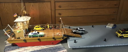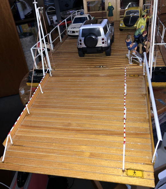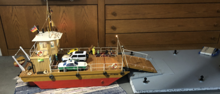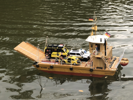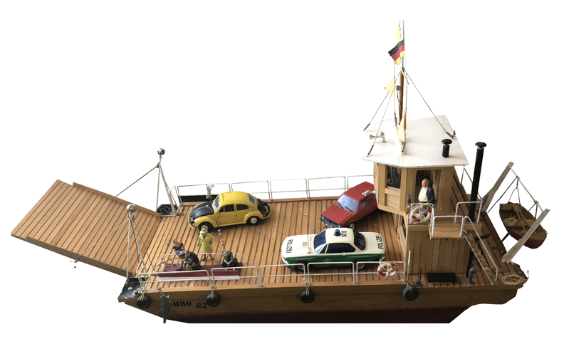 Die Flussfähre ist einer Erinnerung auf der Elbe nachgebaut. Das Modell Jumbo 82 entstand im Jahr 1982 und schlummerte viele Jahre auf dem Dachboden. Der blaue Jeep war ferngesteuert. Mal sehen, ob er einen Nachfolger findet.