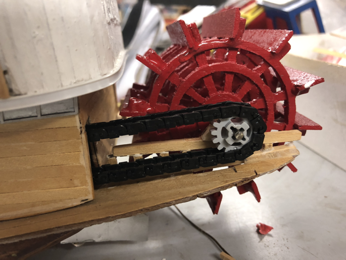 Der Antrieb soll über eine Kette umgesetzt werden. Der beigelegte Bausatz für das Paddle-Rad ist leider gebrochen und wird ersetzt. Hierzu nehme ich Sperrholz und säge neue Räder aus.