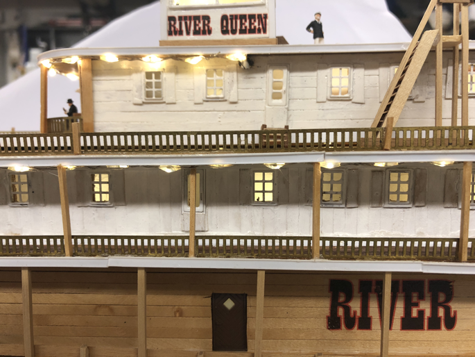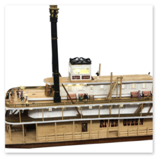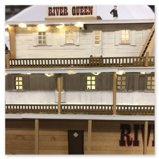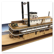 Der Aufbau wird farblich anders bearbeitet, wie es die Vorlage auf dem Karton zeigt. Das Zubehör im Bausatz ist reichlich. Die Fenster sind allerdings gegossen und undurchsichtig. Da ich den Dampfer später beleuchten will baue ich Fenster aus dem Bereich der Modelleisenbahn ein. Passende Größe gibt es. Die Fensterläden schneide ich aus Furnier-Strips.
