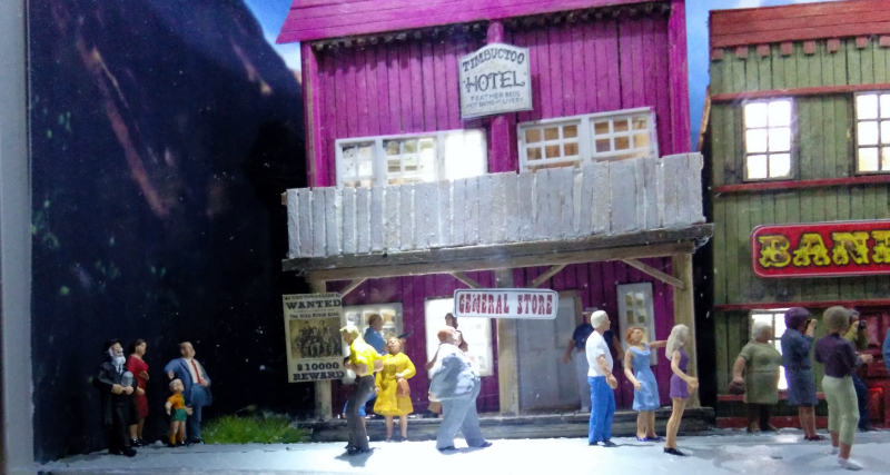 Der Traum der Westerneisenbahn schlecht hin. Die Fahrt von Durango in die Western Stadt Silverton dauert ein paar Stunden und noch "mehr" Dollar. Das Modell zeigt phantasievoll die Einfahrt in Silverton.
