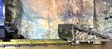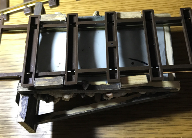 Prellbock-Unterseite mit strakem Karton abgedeckt, damit die Stein-Anmischung mit Holzleim nicht durch die Schienen fällt und damit die Schiene verklebt