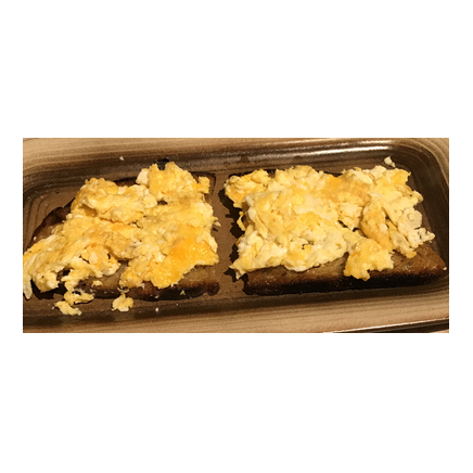 - die Eier zu Rührei verarbeiten und auf die fertig gerösteten Brotscheiben legen