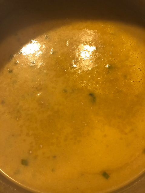 - aus einem Rest Gemüsesuppe habe ich mit Hilfe 1 Esslöffel Mayonnaise, einen Schuss Milch, 1 Teelöffel Curry eine kleine Rahmsuppe gemacht – die Suppe ist als Vorspeise gedacht