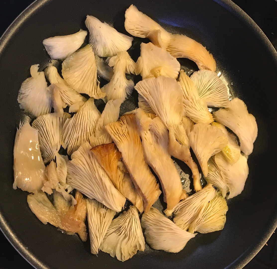 Parallel dazu röste ich die in Streifen geschnittenen Rosenseitlinge in Rabsöl mit Buttergeschmack.