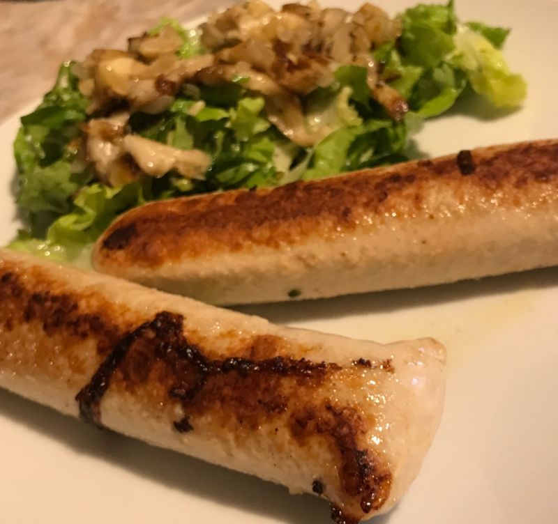 Im Sud und Bratöl der Pilze werden die Oberländer-Würste goldbraun gebraten. Die Austernpilze werden oben auf den fertigen Salat gegeben. Ist der Pilz leicht lauwarm, dann schmeckt es besonders gut.