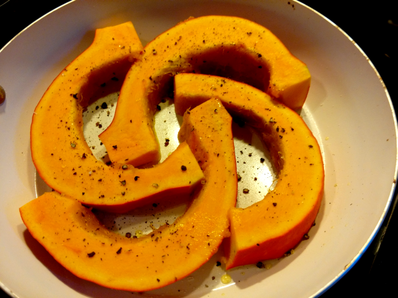 Die halben Kürbisringe in Oliven-Öl anbraten.