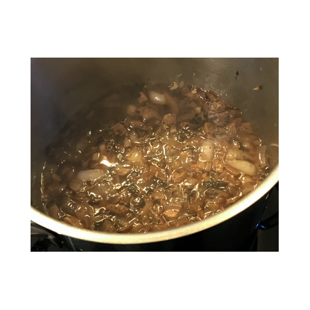 … und die Brühe zu den Zwiebeln usw. dazu geben.